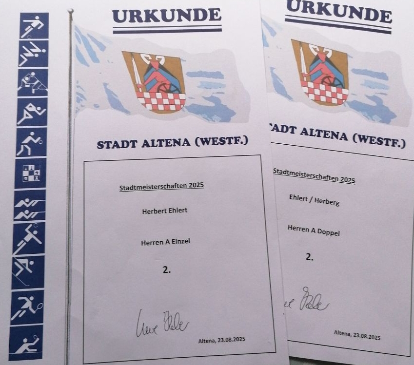 Die Saison 2025/26 blicke ich auf eine ereignisreiche und in vielerlei Hinsicht bemerkenswerte Spielzeit zurück. Das erklärte Ziel der 3. Mannschaft war der Aufstieg in die 2. Bezirksliga – ein ambitioniertes Vorhaben, das lange Zeit realistisch erschien.Bereits vor Beginn der Meisterschaft konnte ich mit starken Leistungen auf mich aufmerksam machen. Bei den Stadtmeisterschaften in Altena erreichte ich den Titel des Vize-Stadtmeisters in der A-Klasse im Einzel sowie einen hervorragenden zweiten Platz im Doppel. Besonders bemerkenswert ist dabei, dass diese Erfolge im Alter von 70 Jahren gegen deutlich jüngere Konkurrenz erzielt wurden – ein eindrucksvoller Beleg für meine Klasse und Erfahrung.